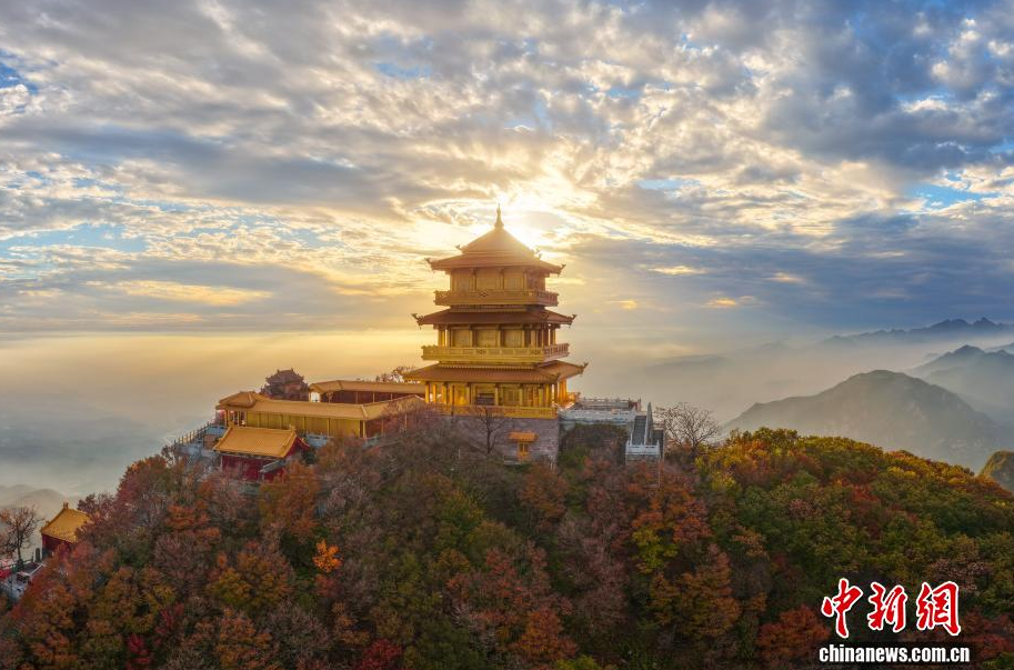 金秋时节,河南济源黄河湿地金黄树影与澄澈水面交相辉映,王屋山山...