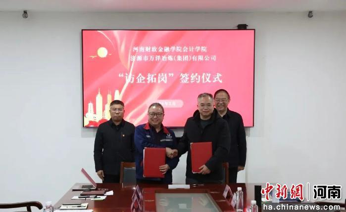 中新网河南新闻2月5日电 (李海珠)为落实高校“五链联动”战略部署,深入推进产教融合、校企协同育人,破解企业人才短缺与学生就业落地双向难题。2月3日,河南财政金融学院会计学院与济源市万洋冶炼(集团)有限公司(以下简称万洋集团)举行“访企拓岗”签约揭牌仪式,共建实践教学基地,开启校企深度合作新篇章。