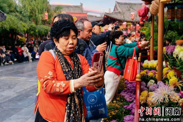 图为绽放的菊花吸引老年游客驻足拍摄。张志恒 摄