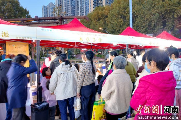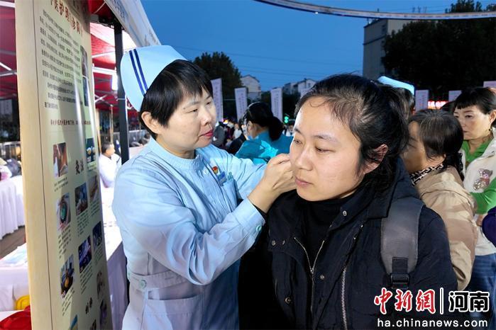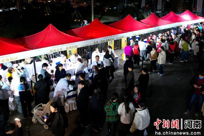 10月31日晚,河南郑州二砂文创园广场中医药文化夜市人气十足,来自郑州市中医院医护人员现场展示推拿、刮痧、耳贴等传统中医疗法,免费为民众提供健康咨询和诊疗服务。