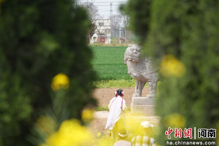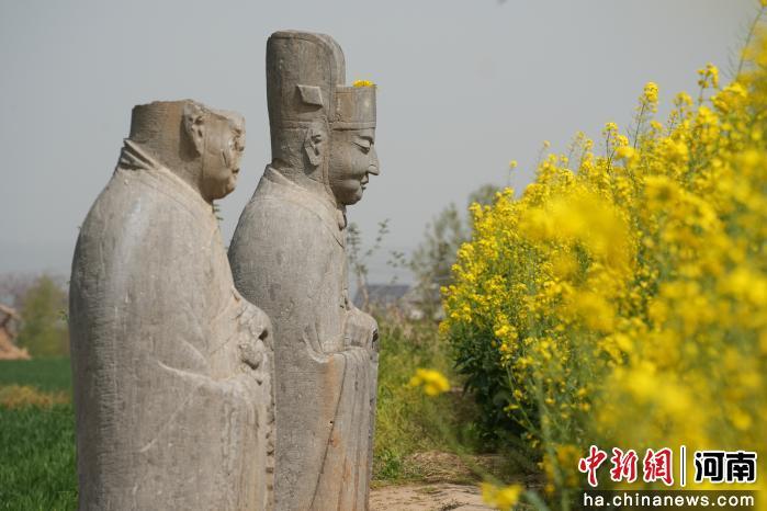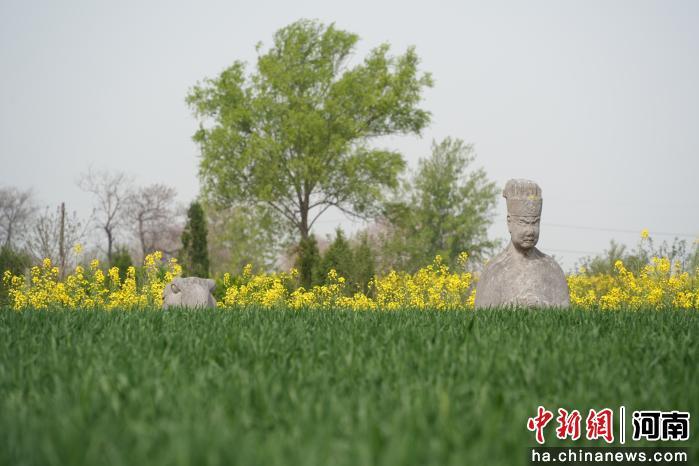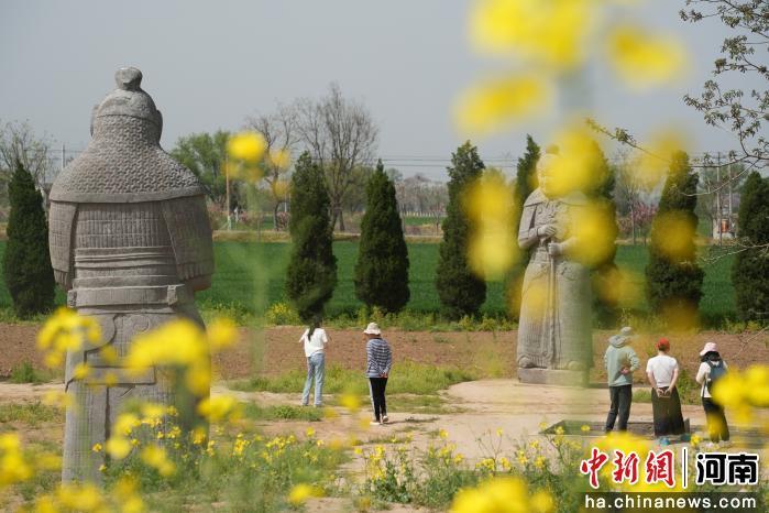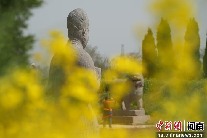 4月5日,清明时节,河南巩义北宋皇陵永裕陵区油菜花竞相绽放,金色花海与伫立千年的石像生交相辉映,吸引游客前来踏青赏花、访古寻踪。